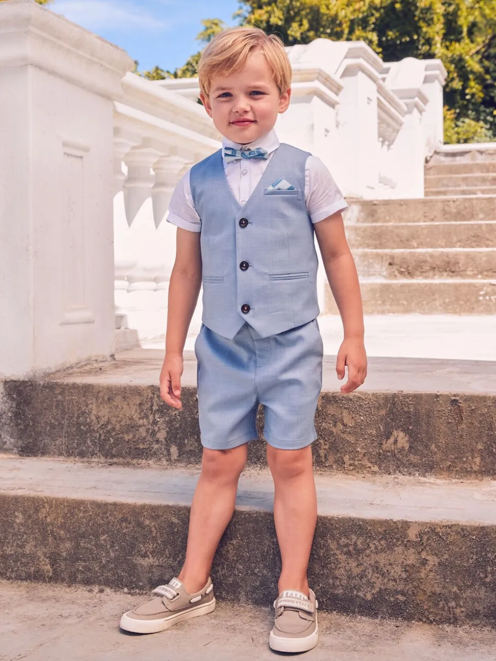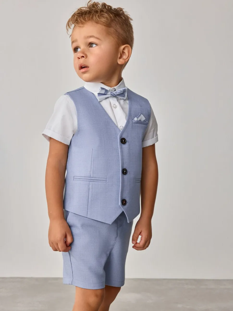Chemise 100% coton. Gilet Main 89% Polyester, 9% Viscose, 2% Elasthanne. Doublure 100% Polyester. Short 89% Polyester, 9% Viscose, 2% Elasthanne. Nœud papillon 100% de polyester.