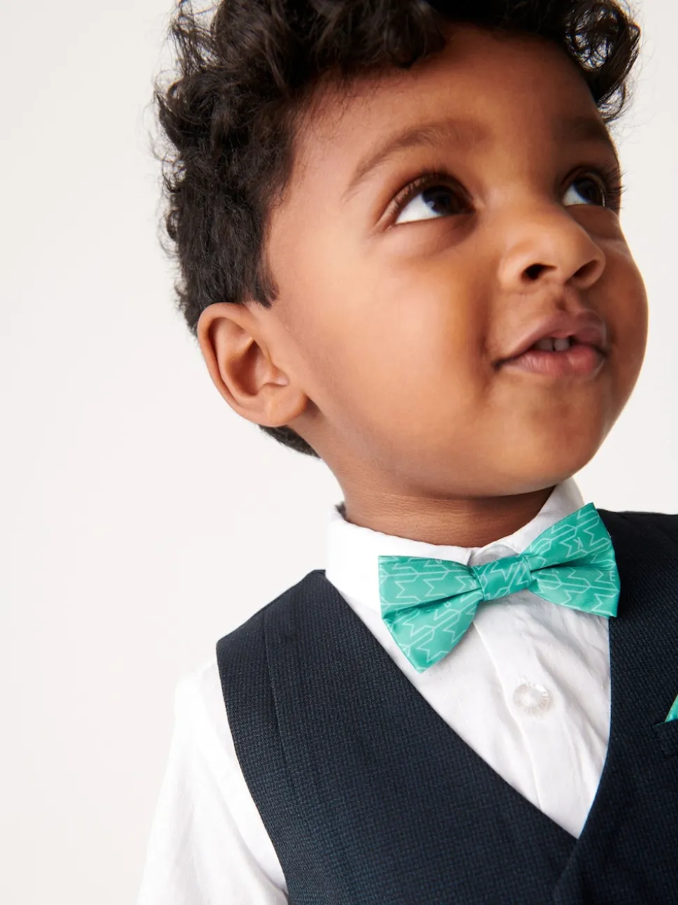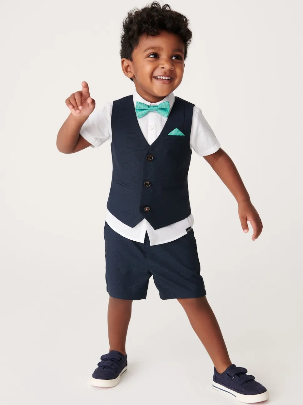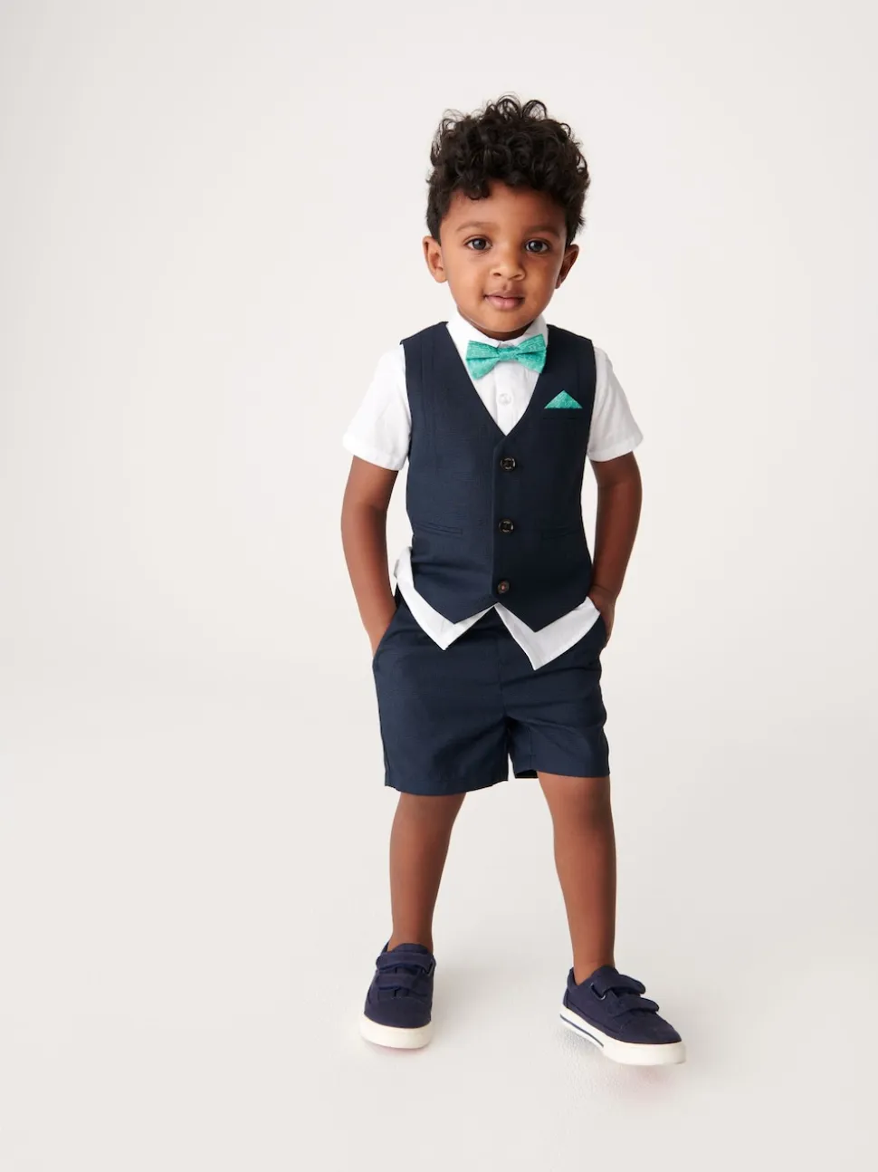 Chemise 100% coton. Gilet Main 78% Polyester, 22% Viscose. Doublure 100% Polyester. Short 78% Polyester, 22% Viscose. Nœud papillon 100% Polyester.