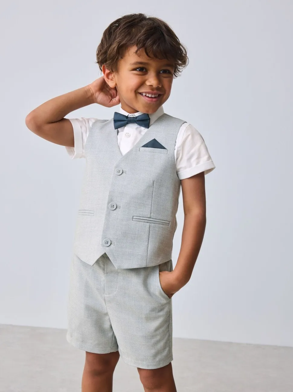 Chemise 100% coton. Gilet Main 85% Polyester, 13% Viscose, 2% Elasthanne. Doublure 100% Polyester. Short 85% Polyester, 13% Viscose, 2% Elasthanne. Nœud papillon 100% de polyester.