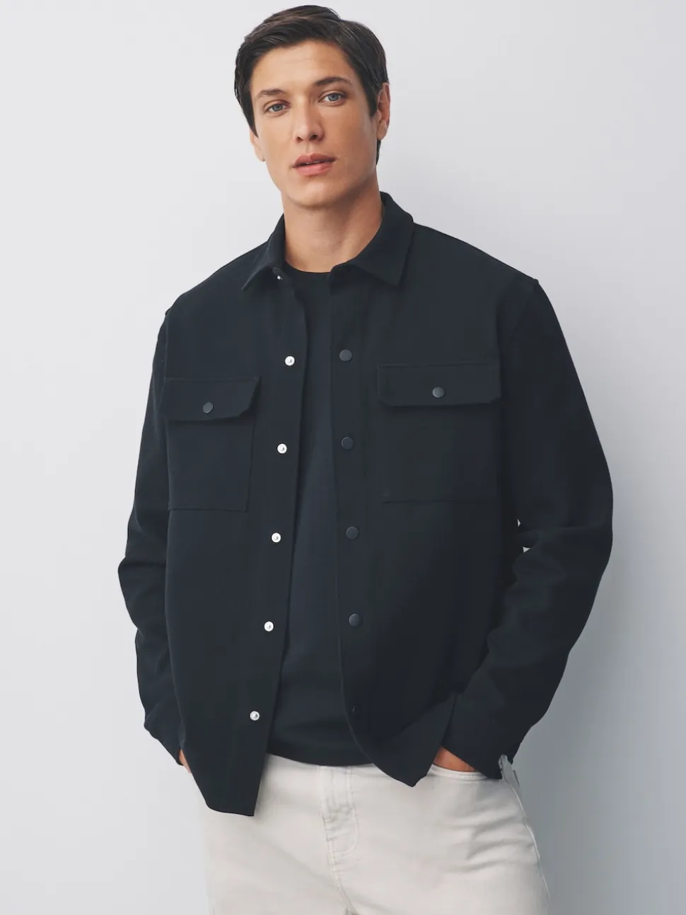 Noir – Veste-chemise en jersey sergé à boutons-pression