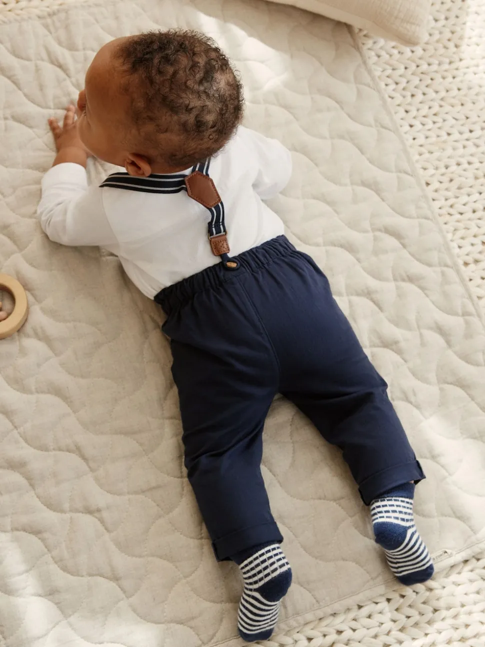 Lavable en machine. Pantalons et chemises 100% coton. Bretelles 88% Polyester, 12% Élasthanne. Avertissement : tenir à l’écart du feu et des flammes.