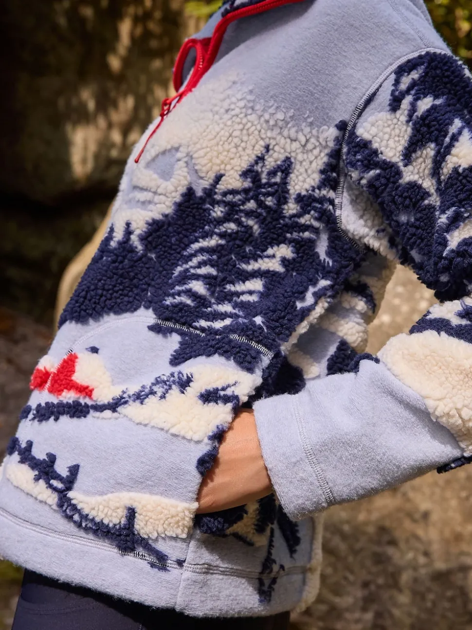 Paysage d’hiver bleu à imprimé graphique – Polaire douce en polaire en peau de mouton à col zippé