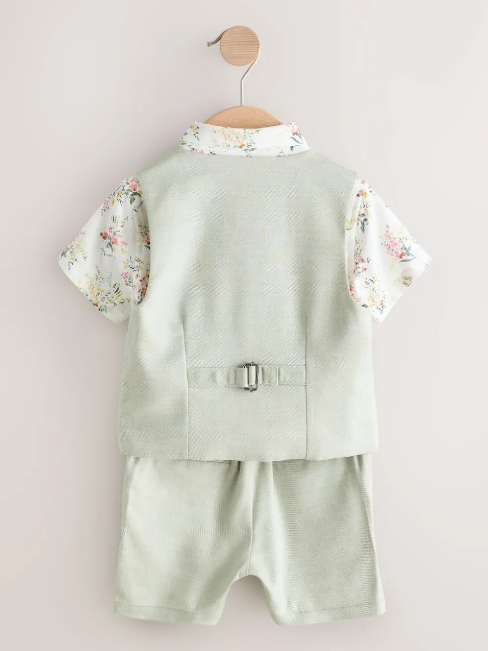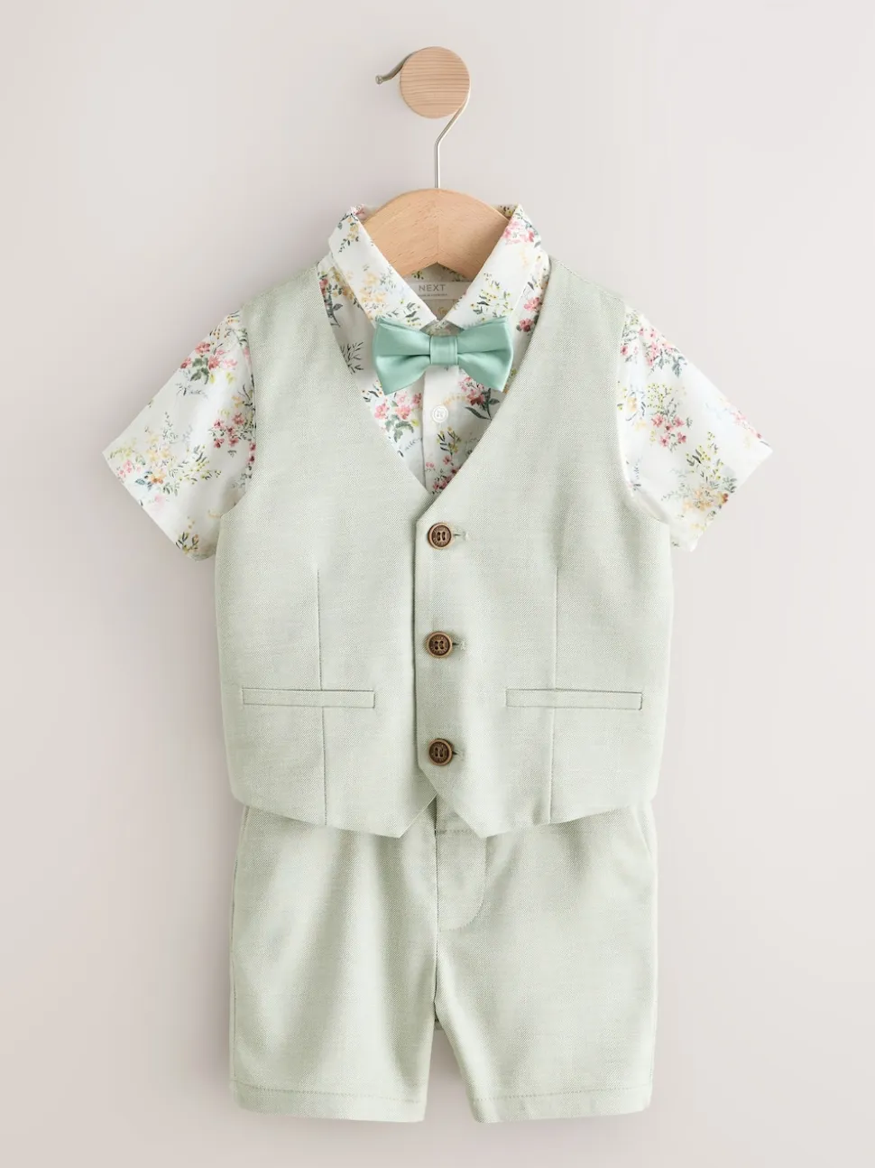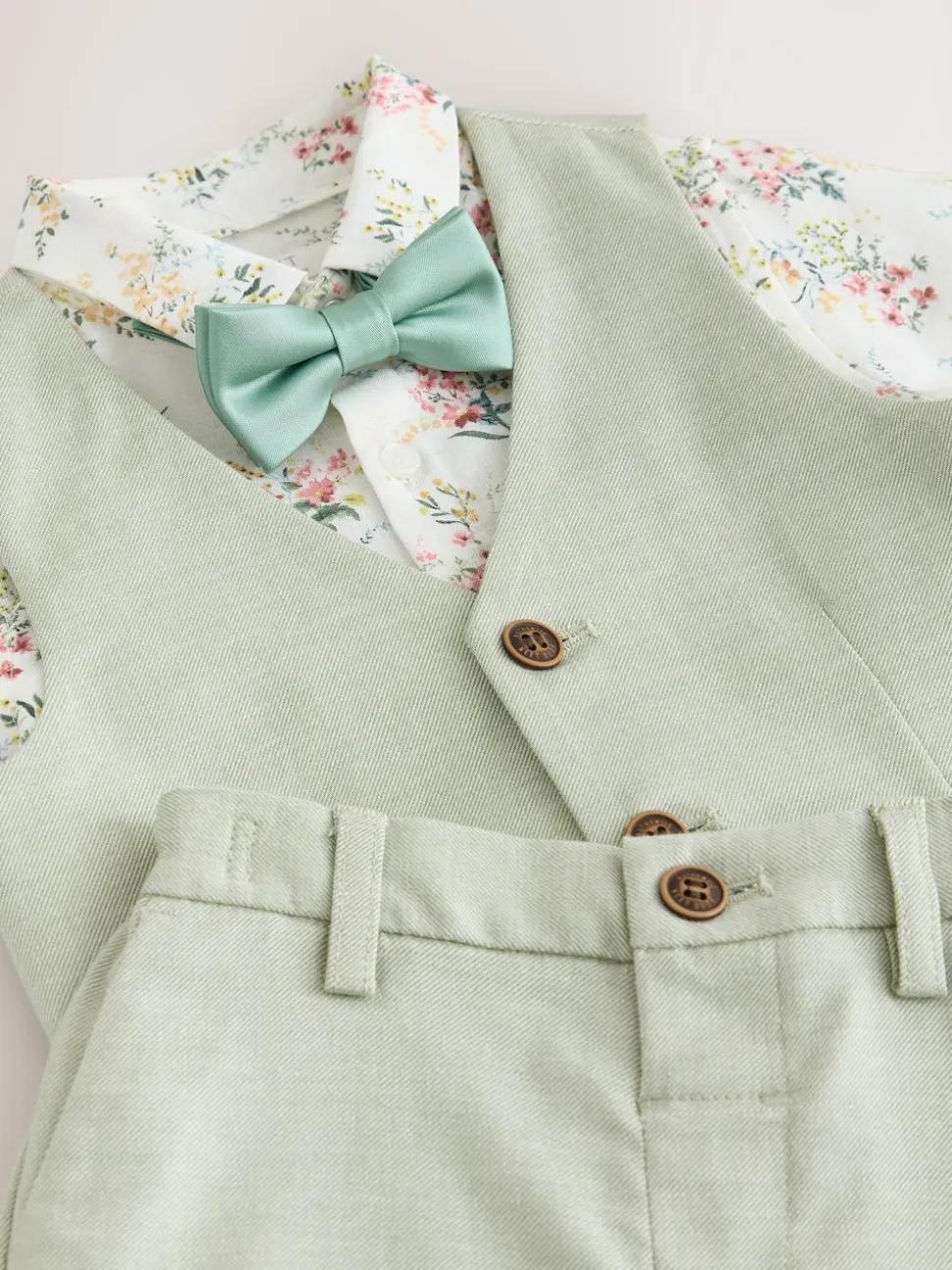 Waistcoat Main 59% Viscose, 23% Polyester, 16% Linen, 2% Elastane. Lining 100% Polyester. Shirt 55% Linen, 45% Cotton. Shorts 59% Viscose, 23% Polyester, 16% Linen, 2% Elastane. Bow Tie 100% Polyester.